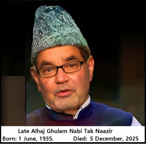 Nine winters have passed since that solemn morning of December 5, 2015, when at 7:30 AM at SKIMS Soura, my beloved father, Alhaj Ghulam Nabi Tak Naazir, known reverently as Naazir Kulgami, departed for his heavenly abode. Inna Lillahi wa Inna Ilaihi Raji’oon. May Allah grant him the highest place in Jannat-ul-Firdaus. Aameen.